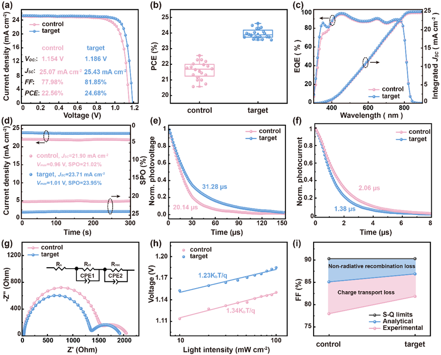 该团队提出一种创新的双锚定分子桥接策略,利用天然无毒、生物相容且耐高温和紫外辐射的氨基酸衍生物Ectoine(Ec)协同减轻SnO2/钙钛矿界面缺陷和残余应力。实验研究结合基于第一性原理的密度泛函理论计算表明,羧基优先钝化SnO2中未配位的Sn4+缺陷和氧空位,而亚胺基与Pb2⁺建立了稳定的配位,钝化未配位的缺陷。双锚定分子桥接机制有助于残余应力释放,从而平滑晶界沟槽,可显著抑制非辐射复合。进一步研究显示,经Ec修饰的PSC实现了24.68%的光电转换效率(PCE)(对照组22.56%)。含有Ec的未封装PSC显示出更高的紫外线环境稳定性,在365 nm紫外线照射(50 mW cm-2)下130小时(相当于1412小时的太阳照射)后,仍能保留80.12%的初始PCE。
