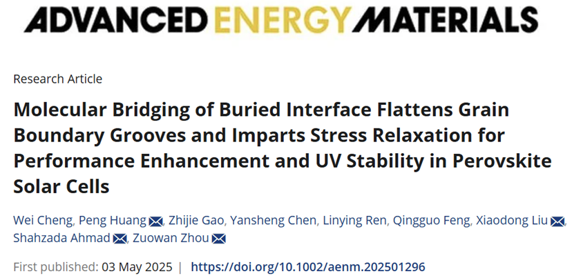 周祚万教授指导的博士研究生程伟同学在钙钛矿太阳能电池埋底界面调控方面的研究取得重要进展,相关研究成果以“Molecular Bridging of Buried Interface Flattens Grain Boundary Grooves and Imparts Stress Relaxation for Performance Enhancement and UV Stability in Perovskite Solar Cell”为题发表在最近出版的国际能源材料顶刊《Advanced Energy Materials》上。程伟为第一作者,澳门六合彩开奖网
