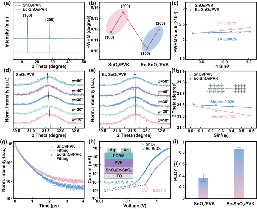 图2. Ec与SnO2和钙钛矿的相互作用与分子桥接机制。