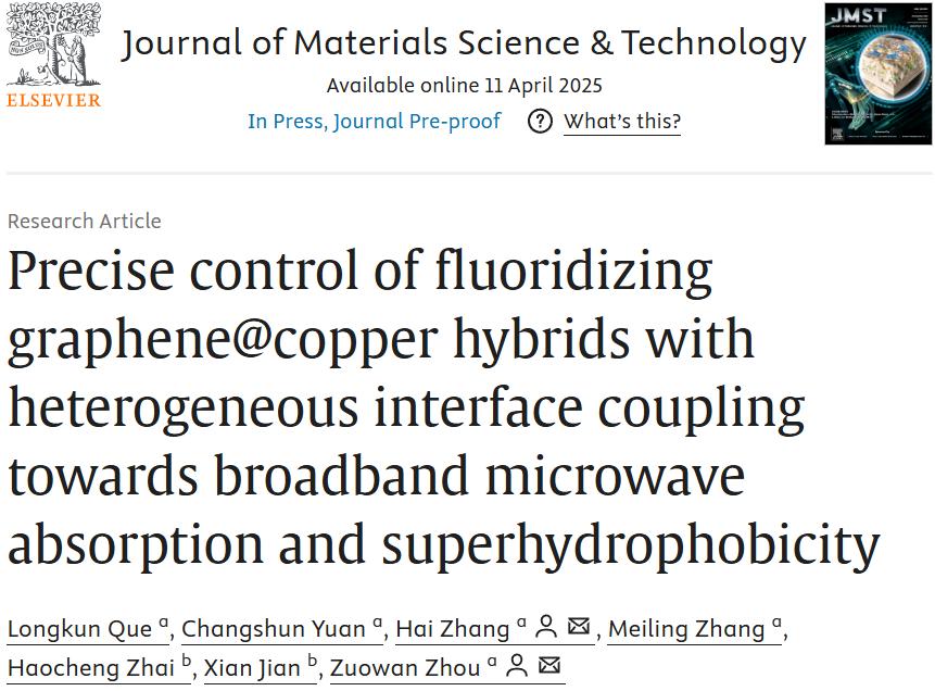博士生阙龙坤在周祚万教授指导下,提出一种基于石墨烯氟化异质界面精准调控策略,同时实现杂化纳米材料高效宽频吸波和超疏水功能。作者在前期提出的前驱体原位分解制备石墨烯包覆通纳米颗粒(GE@Cu,Carbon, 2024, 225: 119121)基础上,通过精确控制石墨烯氟化,调控F-GE@Cu异质界面的功能耦合,实现了纳米材料的宽带微波吸收和超疏水性能。实验和理论研究结果表明,氟化反应显著提升了了材料的阻抗匹配和电磁波损耗;同时,氟化石墨烯壳层结构赋予材料优异的超疏水性(纳米材料水接触角达154°),即使在酸性、碱性和盐溶液等恶劣的水环境中,该杂化纳米材料也能保持稳定结构稳定性和良好电磁波吸收性能。基于电磁参数模拟计算结果显示,3.5mm厚度下氟化纳米材料的反射率衰减可达-53.0dB,有效吸收带宽8.9GHz。相关研究以“Precise control of fluoridizing graphene@copper hybrids with heterogeneous interface coupling towards broadband microwave absorption and superhydrophobicity”为题发表于近期出版的材料科学顶级期刊(中科院一区TOP,中国科技期刊卓越行动计划英文领军期刊)Journal of Materials Science & Technology,2025,238:13-23 (doi.org/10.1016/j.jmst.2025.02.054). 澳门六合彩开奖网