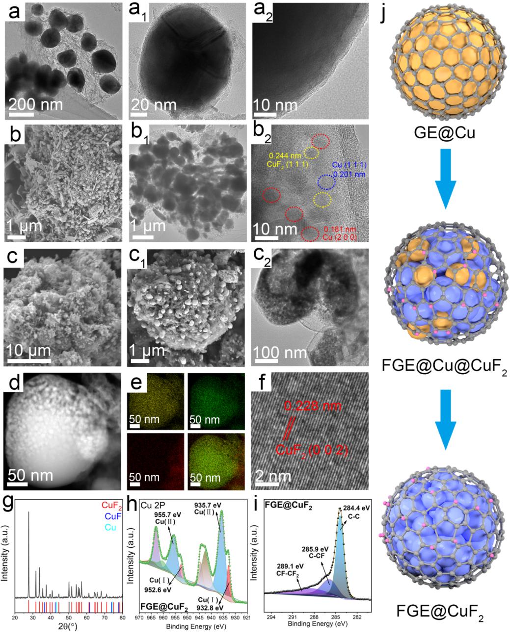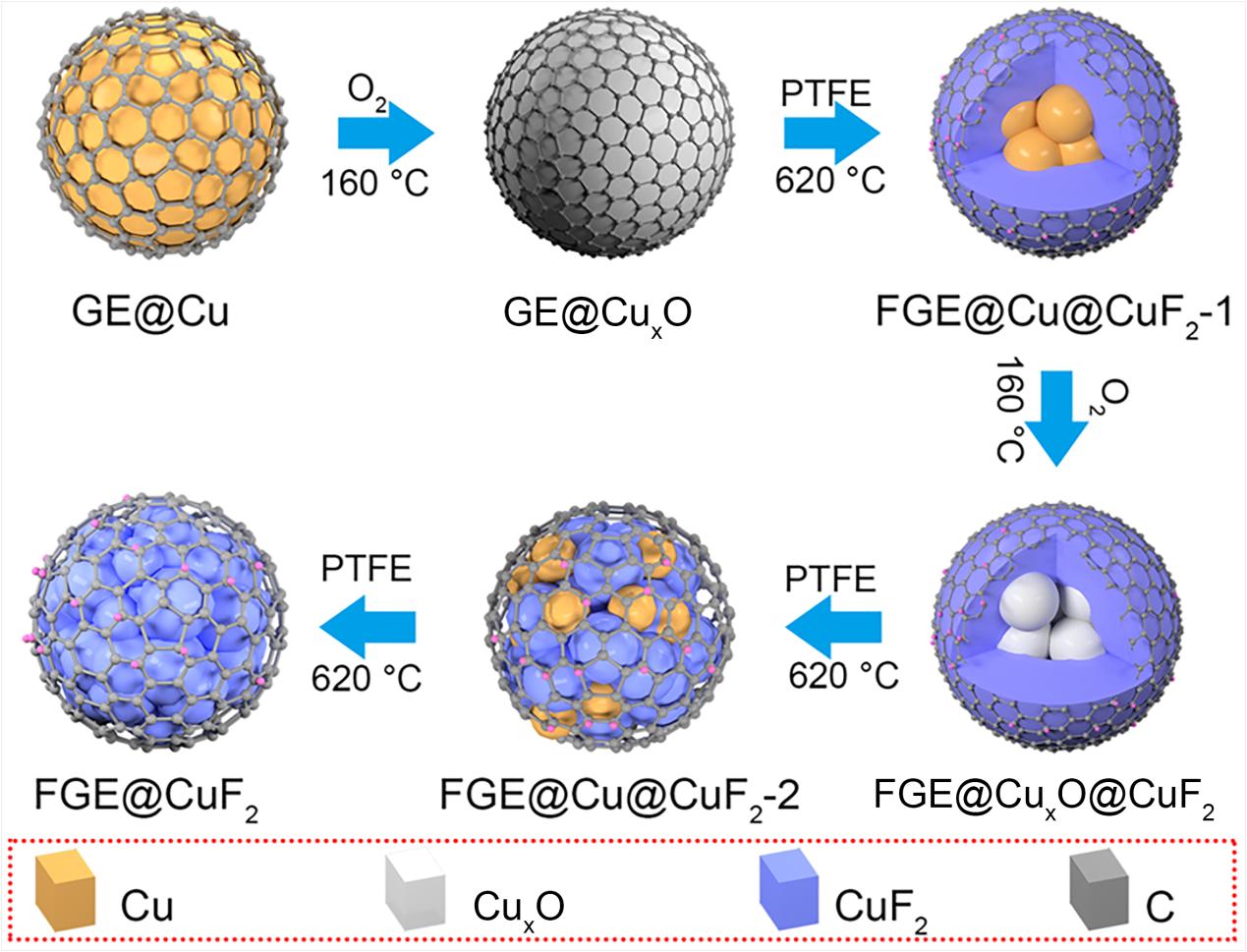 图2. GE@Cu氟化反应调控中F-GE@Cu杂化材料结构演变过程
