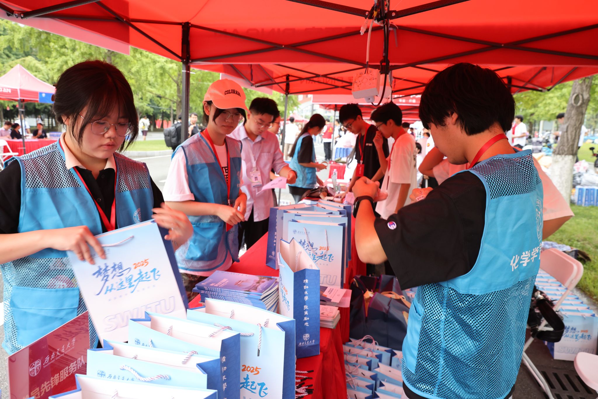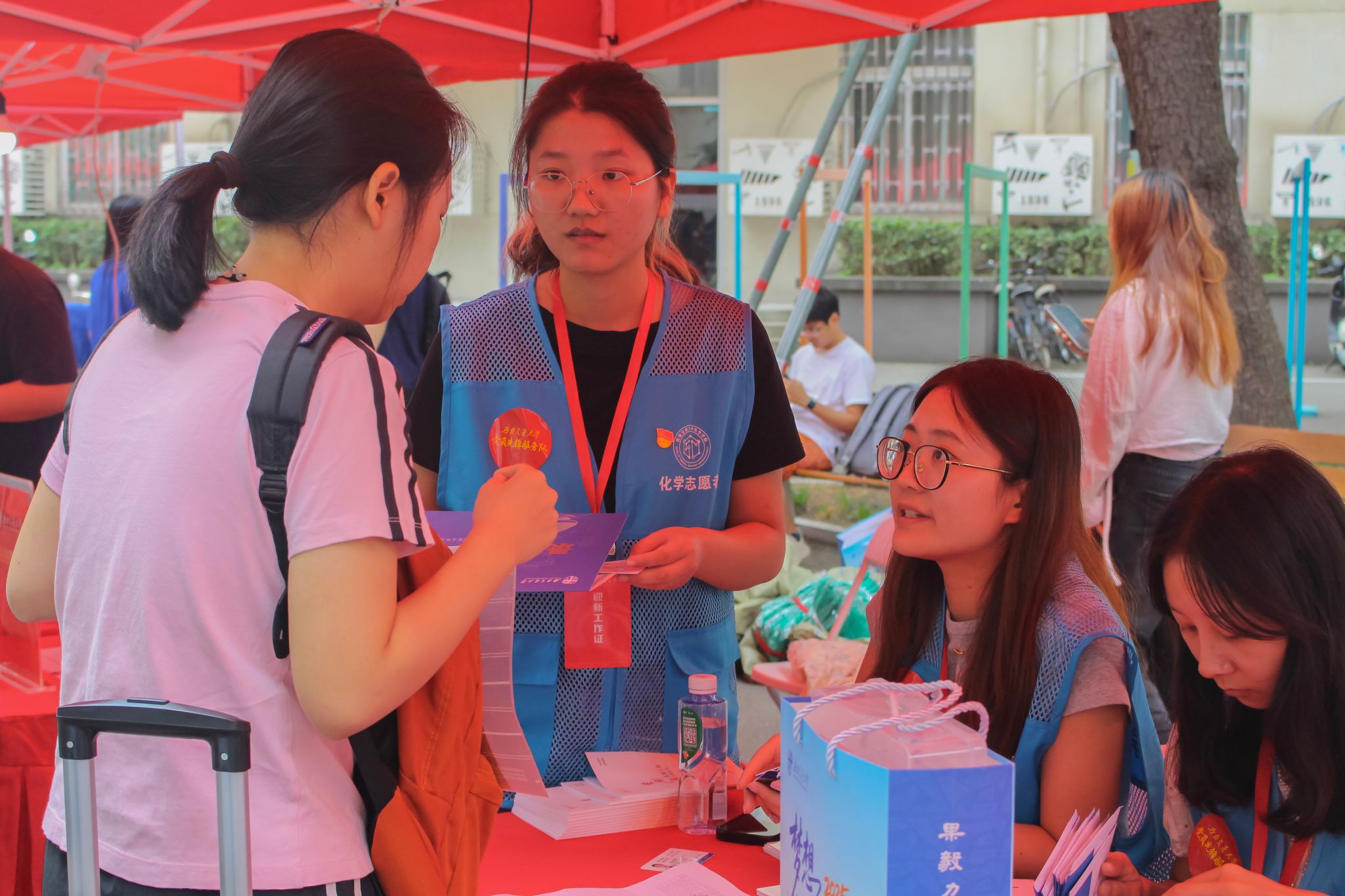 党员服务队、志愿者们同样热情满满,从工作分配、物资筹备整理、新生指引及答疑,每一项工作都在志愿者手中精准高效地完成。