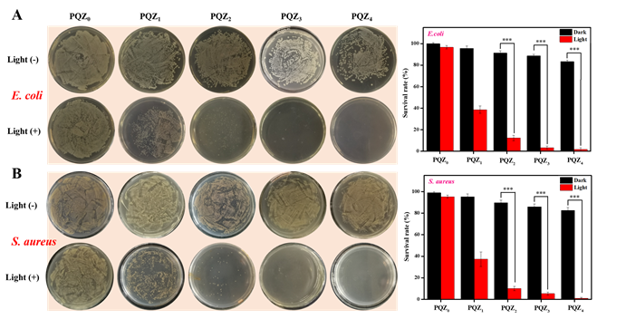研究发现,PQZ复合膜在抗菌实验中表现出优异的光动力抗菌活性和良好的抗细菌粘附性(图 2),并且PQZ复合膜具有良好的机械性能,拉伸强度可达43.4 MPa,约PCL薄膜的1.8倍。此外,SiO2和RB@ZIF-8 NPs的添加,使复合膜具有良好的防水性和紫外阻隔性。在细胞实验中PQZ复合膜呈现较低的细胞毒性,对细胞的生长和繁殖没有明显的抑制作用。