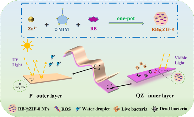 王萃娟课题组通过将金属有机框架与抗菌光动力疗法相结合的策略,制备了一种基于ZIF-8的新型多功能抗菌复合薄膜。将光敏剂孟加拉红(RB)在室温通过一锅法包封至ZIF-8中,得到RB@ZIF-8 NPs。在以聚(ε-己内酯)(PCL)和聚乙烯醇-季铵盐壳聚糖(PVA-QCS)为基质的薄膜中掺杂SiO2和RB@ZIF-8 NPs,以形成具有光动力杀菌的PQZ复合膜(图 1)。