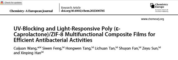 综上,本研究将ZIF-8和抗菌光动力疗法相结合,扩大了ZIF-8的应用范围,为进一步设计合理的抗菌薄膜提供了新思路,PQZ多功能复合膜将作为包装材料有望应用于食品领域。相关成果以“UV-blocking and light-responsive poly (ε-caprolactone) /ZIF-8 multifunctional composite films for efficient antibacterial activities”为题发表在TOP期刊Chemistry - A European Journal(DOI: 10.1002/chem.202300785)。该项工作得到国家自然科学基金(No.21401151)、四川省科技计划项目(No.2021YFSY0048)和中央高校医工结合项目(No.2682021ZTPY015)的支持。