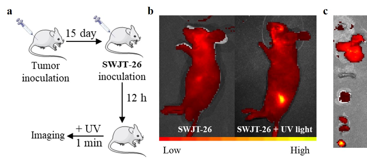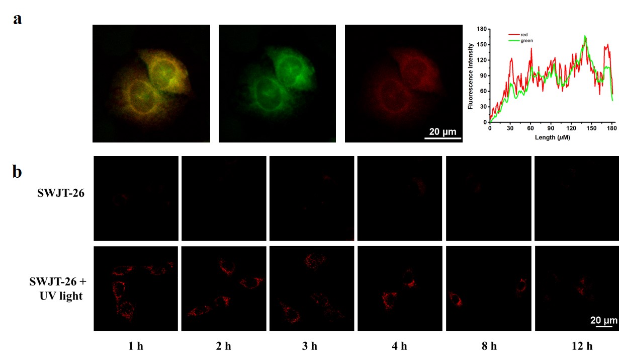 在这项工作中,作者通过逐步设计策略合成了一系列以罗丹明B为荧光基团的光激活荧光探针,并筛选出最合适的探针(SWJT-26)。研究表明,该探针可以在405 nm的蓝紫光照射下发生开环并产生红色荧光。值得注意的是,整个反应从开始到结束仅需要不到20秒,是目前反应最快速的小分子光激活探针。此外,该探针还具有极高的专一性和光学性质。为了拓展应用,作者通过合理修饰提高了探针的脂溶性,从而使其可以靶向于内质网。基于这些特点,SWJT-26实现了对细胞和裸鼠中内质网的时间控制成像。
