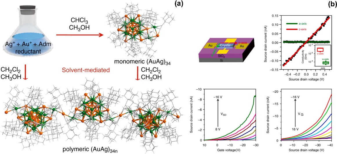 图6. 溶剂引发的(AuAg)3₄ 团簇的一维聚合及其导致的各向异性导电性能。