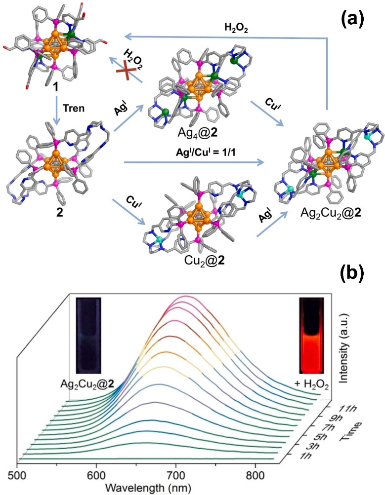 图7. AgXCuy@Au6Ag2 团簇的结构演化及其对双氧水的荧光响应。