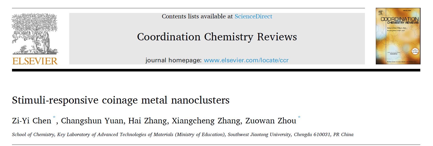 周祚万教授和陈子毅助理教授团队在国际权威综述期刊 Coordination Chemistry Reviews(影响因子23.5,中科院一区TOP期刊)发表题为 “Stimuli-responsive coinage metal nanoclusters” 的长篇综述论文,系统梳理了刺激响应型金属纳米簇的研究进展,为该领域的未来发展提供了重要参考与前瞻性思考。