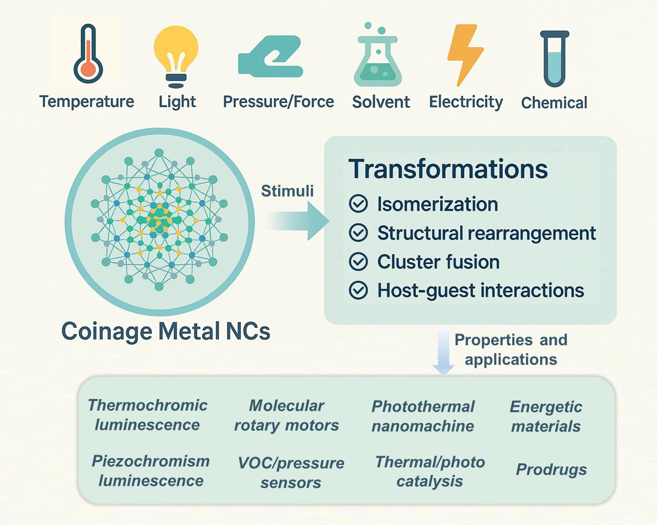 本综述围绕金、银、铜等币族金属纳米簇,详细归纳了其在六类外界刺激(包括温度、光照、压力/机械力、溶剂、化学试剂和电场)作用下的结构演化与性能调控机制。文章重点介绍了诸如热致变色发光、光诱导异构化、压力驱动构型重组以及溶剂诱导自组装等典型实例,突出纳米簇在动态响应过程中的构型可逆性与功能可调性。该综述特别强调“原子级精确结构”在揭示刺激响应行为机制中的核心作用,并指出多刺激协同响应材料和计算辅助设计在未来研究中的潜力。文章不仅为设计新型智能响应材料提供理论支持,也为自旋电子学、生物传感与前药释放、分子机器等前沿应用拓展提供了新的思路。