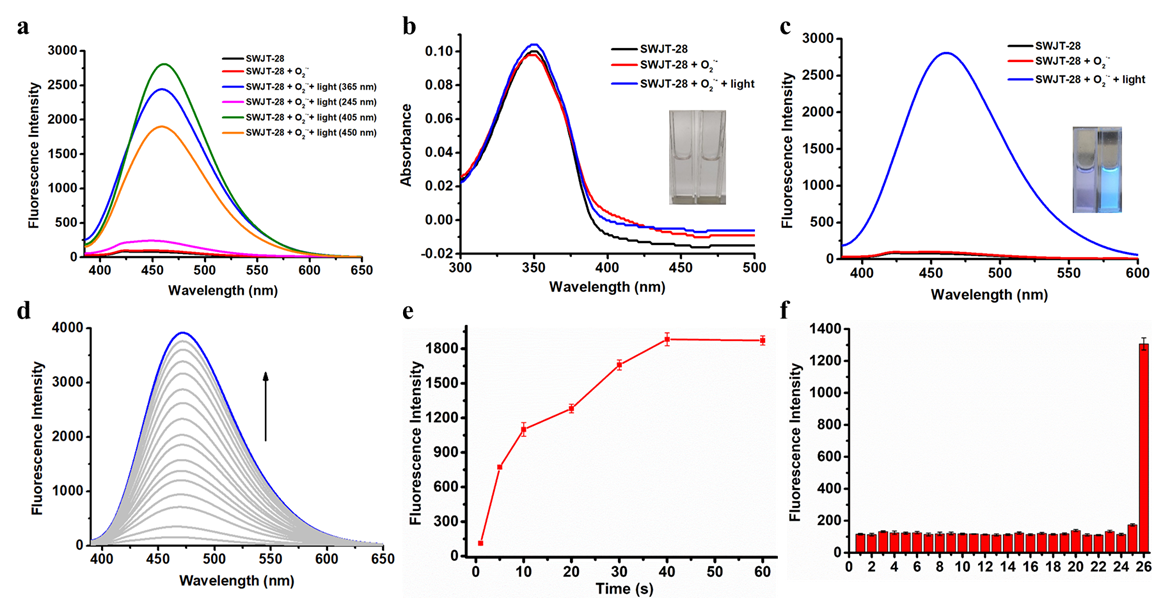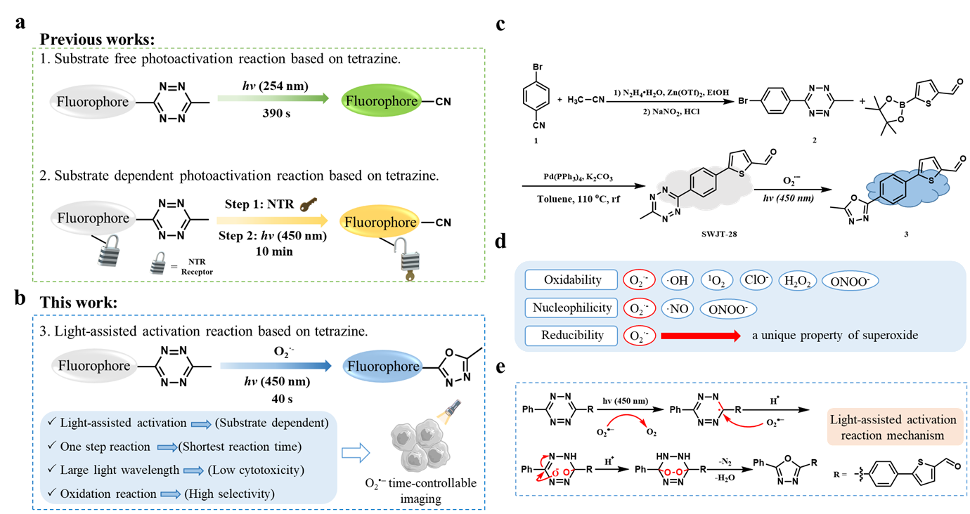 近期,澳门六合彩开奖网 王雅雯教授带领研究团队合成了一种以四嗪为识别基团的荧光探针SWJT-28,并首次提出“光辅助激活”策略。研究表明,该探针可以在450nm的蓝光照射下快速与超氧阴离子发生反应并产生荧光。与传统的接力识别策略不同,该探针需要蓝光和超氧阴离子同时存在才能开启荧光,实现了一步激活,显著缩短了光照和响应时间(<40秒)。这种新的反应方式可以帮助监测细胞中超氧阴离子在任意时间点的浓度以及整体波动情况。基于此,作者成功将其应用于HeLa细胞和氧葡萄糖剥夺模型的时间控制成像,验证了SWJT-28在氧化还原研究中的实用性。