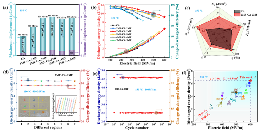 图5. (a) 不同复合薄膜在150 ℃的极化能力比较。 (b) 不同复合薄膜在150 ℃的储能性能。 (c) CA和2MF-CA-2MF在150 ℃的介电和储能性能比较。(d) 在600 MV/m和150 ℃时,在2MF-CA-2MF的不同区域测试的储能性能。(e) 2MF-CA-2MF在500 MV/m和150 ℃的循环耐久性。(f) 2MF-CA-2MF与文献报道的其他薄膜在150 ℃储能性能比较。