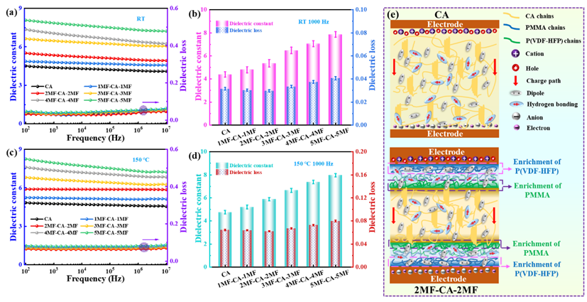 图2. (a) 不同复合薄膜常温介电性能频谱图。 (b) 不同复合薄膜常温1000 Hz时介电性能对比图。(c) 不同复合薄膜150 ℃介电性能频谱图。(d) 不同复合薄膜150 ℃和1000 Hz时介电性能对比图。(e) 介电性能随外层厚度变化机理示意图。