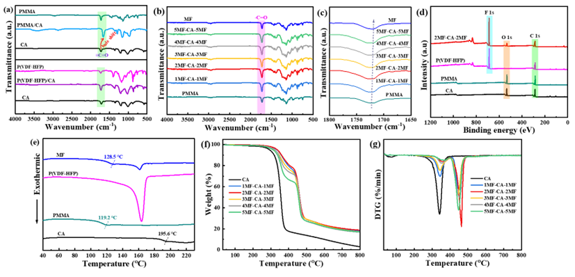 图1. (a) CA, PMMA, P(VDF-HFP), P(VDF-HFP)/CA 和PMMA/CA共混物的红外光谱。(b, c) 不同复合薄膜的红外光谱。 (d) CA, PMMA, P(VDF-HFP)和2MF-CA-2MF复合薄膜的XPS光谱。 (e) CA, PMMA, P(VDF-HFP)和MF共混物的DSC曲线。(f, g) 不同复合薄膜的TGA和DTG曲线。