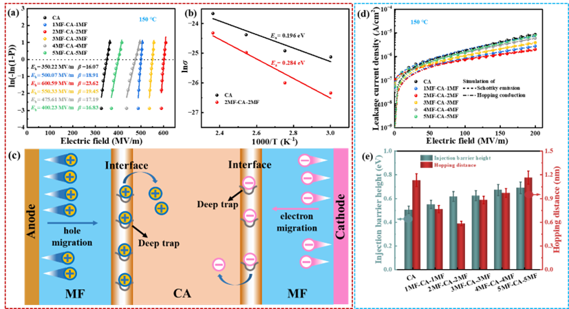 图3. (a) 不同复合薄膜的Weibull分布图。(b) CA和2MF-CA-2MF复合薄膜的lnσ对逆温度(1000/T)的拟合曲线。(c) 通过界面处的深陷阱捕获空间电荷的过程的图示。(d) 不同复合薄膜在200 MV/m和150 ℃的漏电流密度。(e) 不同复合薄膜的势垒高度和跳跃距离汇总。