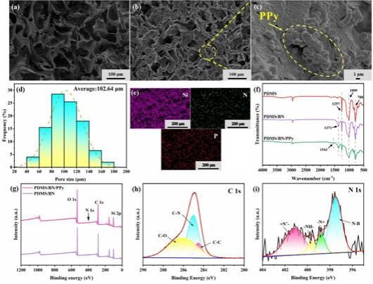 图1 (a) PDMS/BN和(b,c) PDMS/BN/PPy的扫描电镜图像;(d) PDMS/BN的孔径统计;(e) PDMS/BN/PPy泡沫的EDS分析;(f) PDMS、PDMS/BN和PDMS/BN/PPy的傅立叶变换红外光谱;(g) PDMS/BN和PDMS/BN/PPy的XPS光谱;PDMS/BN/PPy的高分辨率;(h) C 1s和(i) N 1s XPS光谱