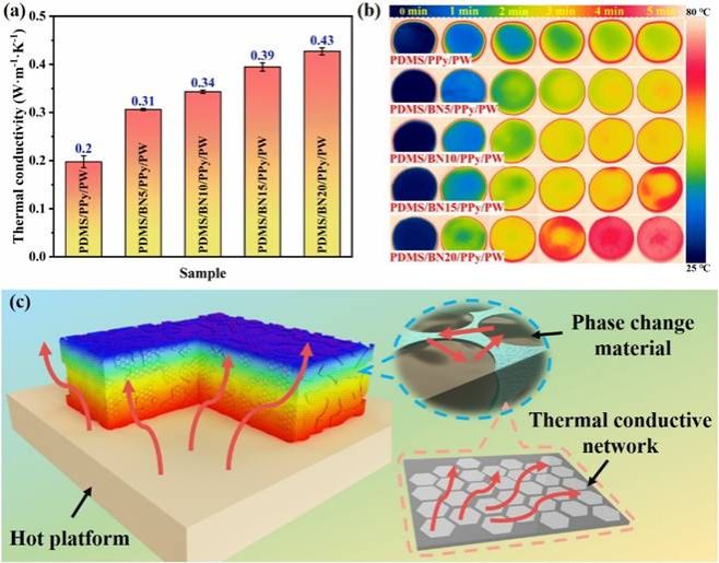 图3 (a) 不同BN含量的PDMS/BNx/PPy/PW的热导率和(b)瞬时红外热成像温度分布图;(c) PCCs的热传导机理图