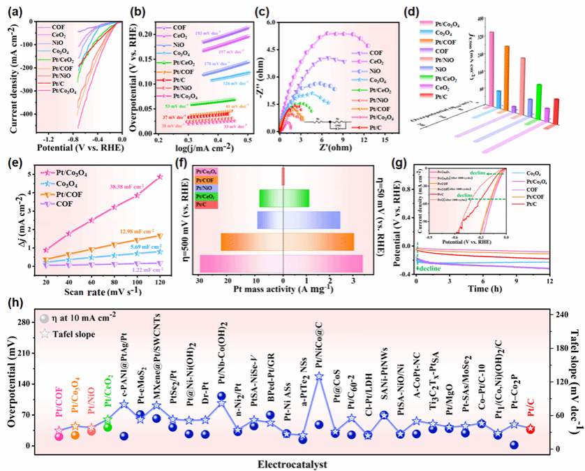 在这项工作中,作者利用一种简单可控的低温固液反应 “铂化”策略,成功地将 Ptδ+掺杂到了具有的富电子特性的载体中。利用具有富电子位点的无机或有机化合物(Co3O4、COF、NiO、CeO2 等)作为支撑基底,合成了一系列催化剂(Pt/X),并探索了它们的电催化性能。在这些 Pt/X 催化剂中, Pt/Co3O4 和 Pt/COF 表现出出色的催化活性。得益于界面 Ptδ+/富电子位点的协同效应,超低 Ptδ+ 负载的 Pt/Co3O4 和 Pt/COF 分别显示出 21 mV 和 23 mV 的超小过电位,并且在 1 M KOH 中,电流密度为 10 mA cm-2 时具有极佳的稳定性。令人惊讶的是,铂含量仅为 0.63 wt% 的 Pt/Co3O4 在 500 mV 的过电位下可提供 348 mA cm-2 的超高工业相关电流密度,是铂含量为 20 wt% 的商用 Pt/C 的 3.22 倍,实现了真正意义上的低铂负载和高铂利用率。密度泛函理论(DFT)计算结果表明,Pt/ Co3O4和Pt/COF中的Ptδ+/富电子位点优化了氢吸附的自由能,提高了催化剂在碱性介质中的HER性能。这项工作为高效电催化剂的设计和开发提供了一条新的途径。