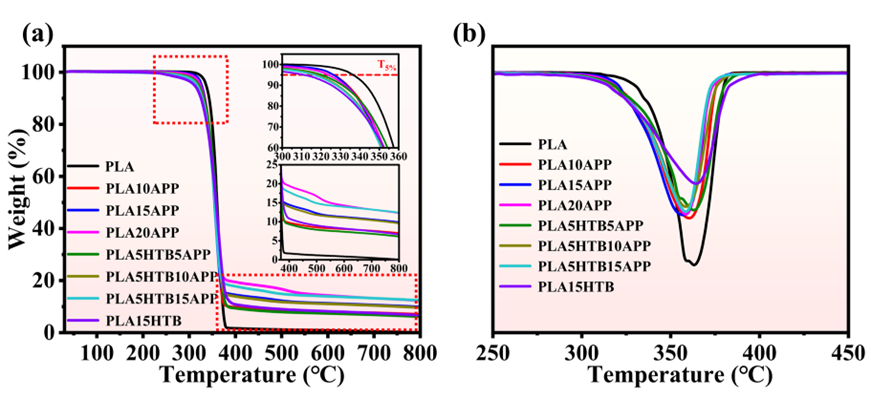 图4:(a) PLA及其复合材料的TGA曲线;(b) PLA及其复合材料的DTG曲线。测试环境在氮气气氛进行。