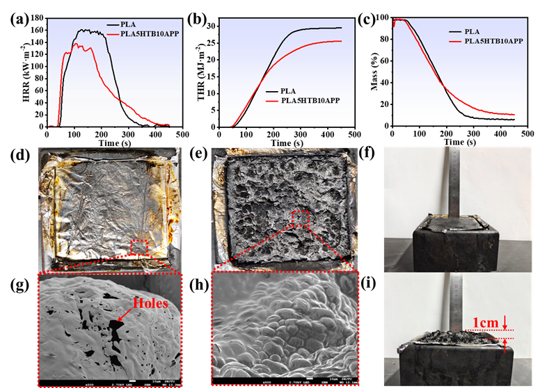 图5:锥形量热测试结果:(a) 放热率;(b) 总放热和 (c)质量损失曲线;(d,e) 锥形量热测试后,PLA和PLA5HTB10APP炭层的数码照片以及 (e,h) SEM图像;(f) PLA和(i) PLA5HTB10APP样品燃烧后炭层高度的数码照片。