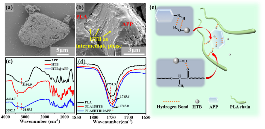 图2:(a) HTB@APP的SEM图像;(b) 复合材料低温脆断SEM图像;(c) HTB、APP和HTB@APP的FTIR光谱;(d) PLA及其复合材料羰基特征峰的FTIR-ATR光谱;(e) PLA复合材料中多个氢键相互作用示意图。