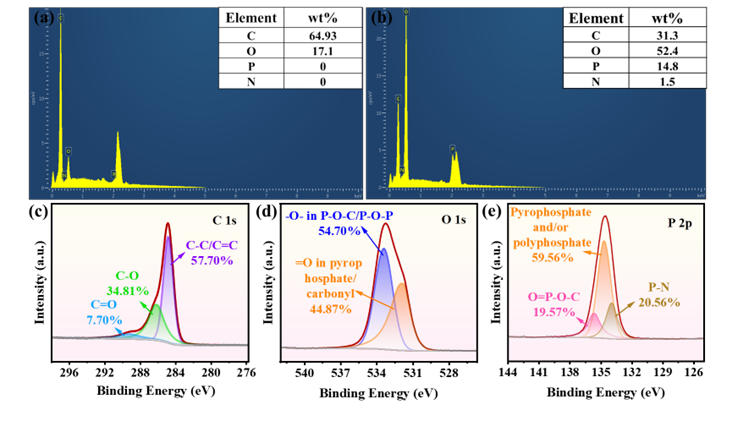 图6:(a) 纯PLA和(b) PLA5HTB10APP样品残炭的EDS光谱。残炭的XPS高分辨率光谱:(c) C1s;(d) O1s;(e) P2p。