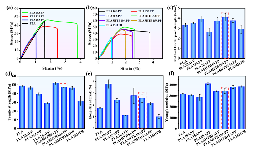 图9:(a,b) PLA及其复合材料的拉伸应力-应变曲线和 (c) 缺口冲击强度。PLA及其复合材料的机械性能 (d) 拉伸强度、(e) 断裂伸长率和 (f) 杨氏模量。