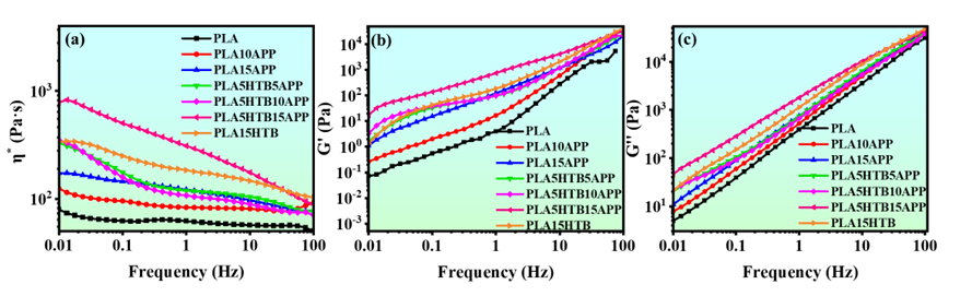 图3:PLA及其复合材料的流变行为。(a) 复数粘度;(b) 储存模量;(c) 损失模量。