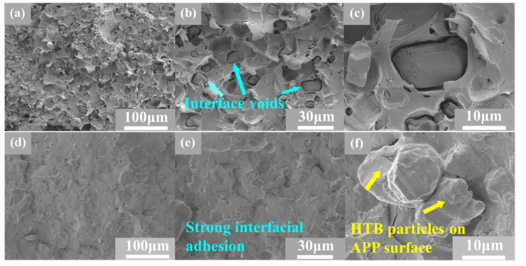 图10:在不同放大倍数下获得的拉伸样品断裂面的SEM图像:(a-c) PLA15APP样品和 (d-f) PLA5HTB10APP样品。