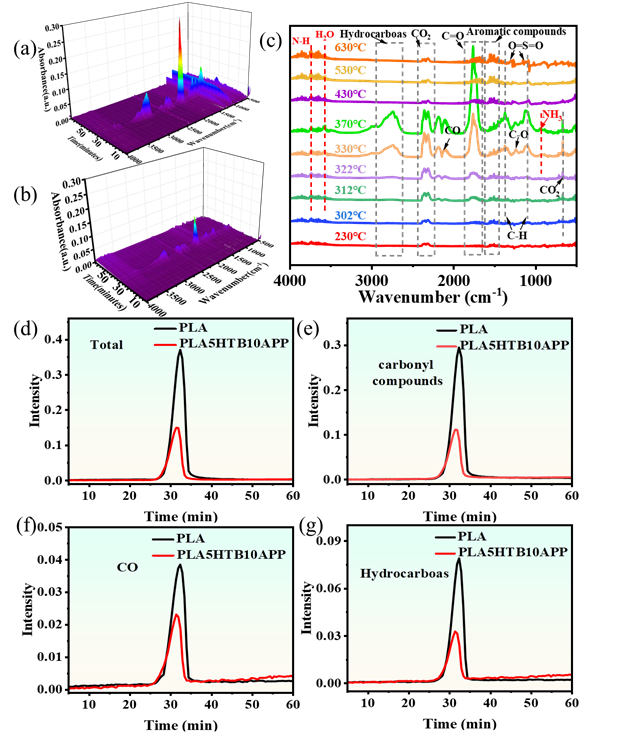 图7:(a) PLA,(b) PLA5HTB10APP的TG-IR光谱;(c) PLA5HTB10APP在不同温度下热分解产物的红外光谱曲线;PLA和PLA5HTB10APP热分解产物的吸收光谱:(d) 总吸收;(e) 羰基化合物;(f) 一氧化碳;(g) 碳氢化合物。