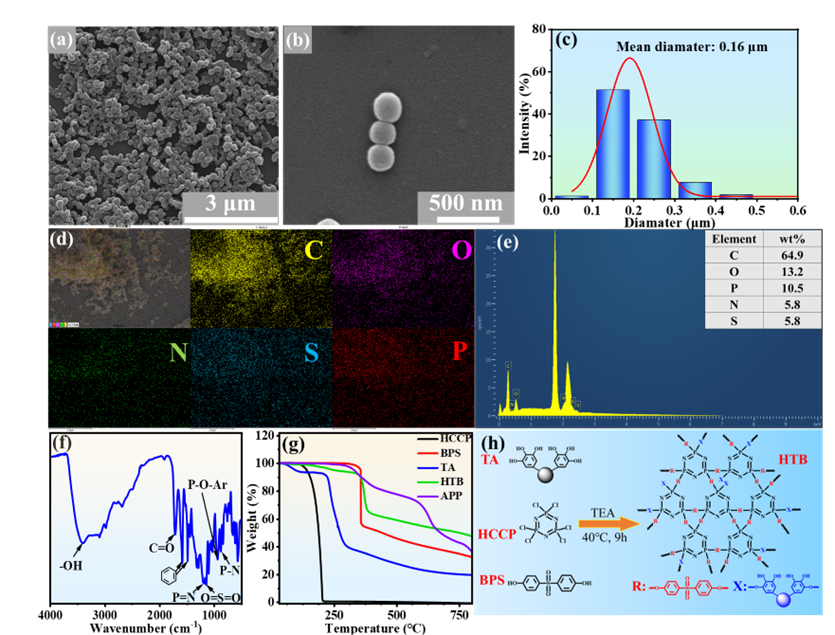 图1: HTB纳米颗粒的表征。(a, b) SEM图像;(c) 对应粒度统计分布图;(d) EDS图;(e) EDS元素含量;(f) FTIR光谱;(g) APP、HTB及其组分的TGA曲线;(h) HTB合成图。