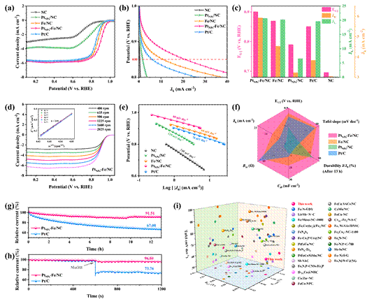 在这项工作中,作者基于Pt金属的电负性特征和尺寸效应对ORR路径的影响,构建了具有低含量Pt纳米颗粒修饰Fe-N-C的多尺度催化位点协同的双金属催化剂PtNPs-Fe/NC。研究表明,Pt 纳米颗粒和 Fe 金属位点之间存在显著的定向电子转移路径,这种定向电子转移促进了金属位点之间的协同电子效应,进而实现了对Fe位点周围电子密度的有效调控。结果显示,所制备的 PtNPs-Fe/NC 催化剂在ORR中表现出优异的催化活性,其半波电势(E1/2)达到了 0.901 V,优于商业 Pt/C、单金属催化剂 Fe/NC、PtNPs/NC 以及大多数已报道的催化剂。而且PtNPs-Fe/NC 的稳定性和甲醇耐受性也得到显著提升。进一步将制备的 PtNPs-Fe/NC 催化剂应用于自制的ZABs中。基于 PtNPs-Fe/NC 的液态ZABs实现了令人印象深刻的峰能量密度(201.48 mW cm-2)和超高的比容量(809 mAh g-1),接近ZABs的理论比容量(820mAh g-1),并且能够平稳地充放电超过 100 小时。此外,基于 PtNPs-Fe/NC 的柔性固态ZABs也表现出良好的放电能力和循环稳定性。该研究强调了多尺度催化活性位点构建在提升ORR催化剂性能中的作用,为储能设备中催化剂的设计提供了有价值的见解。