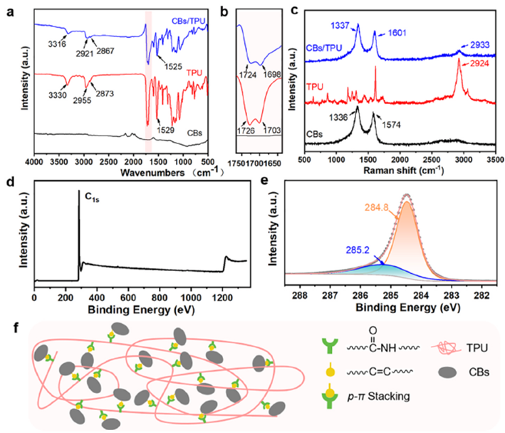 2 CBsTPUCBs/TPU复合纤维的结构表征及其相互作用示意图。aCBsTPUCBs/TPU纤维的红外光谱图,ba中标记区域的放大图;cCBsTPUCBs/TPU复合纤维的拉曼光谱图;dCBsXPS全谱图,eC1s高分辨扫描谱图;fCBs/TPU纤维内部CBsTPU之间相互作用的示意图。