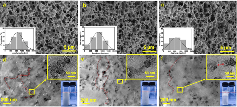 3 溶剂冻胀驱动导电网络弛豫。(a-c)不同比例的乙醇/水混合溶剂为冰冻模板制备的纤维的SEM图和(d-fTEM图。(adEtOHDI体积比为37;(beEtOHDI体积比为19;(ceEtOHDI体积比为010。(a-c)中的插图显示相应SEM图的孔径分布。(d-f)中的红色虚线表示导电路径。(d-f)中的插图(右上)是黄色矩形中的放大视图,显示(d)为“紧密堆积”的导电路径,(e)临界搭接的导电路径和(f)不完美的到导电路径。(d-f)中的插图(右下)是混合溶剂冷冻前后的数码照片。