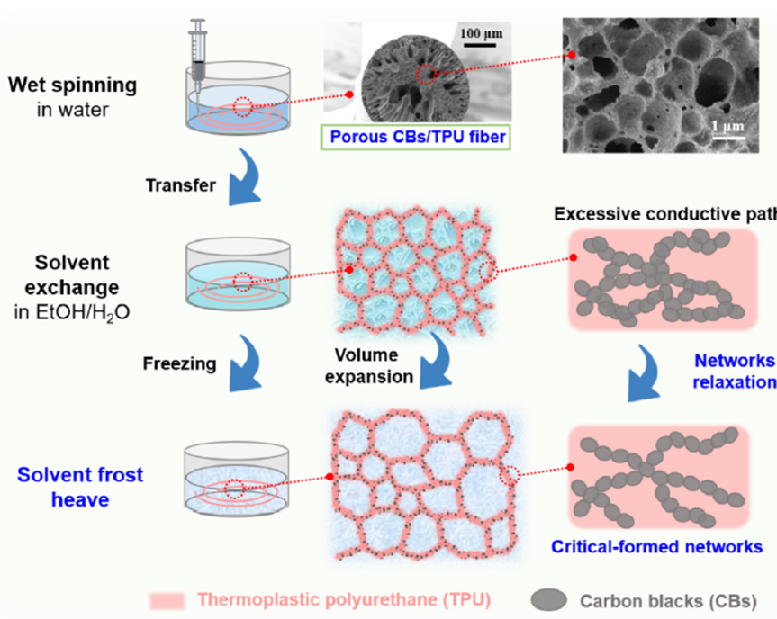 西南交通大学周祚万课题组Composites Science and Technology:溶剂冻胀驱动炭黑/聚氨酯纤维的导电网络弛豫实现高灵敏应变响应