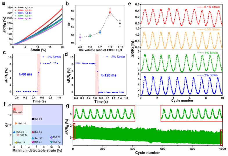 4 具有临界导电网络结构的CBs/TPU纤维的应变—电阻响应特性。(a)在微小应变下纤维的应变-电阻响应曲线。(b)响应灵敏度因子(GF)。(c)响应和(d)恢复时间。(e)在0.1%0.5%1%2%的微小应变下循环拉伸-释放的响应曲线。(f)已报道的基于导电填料的电阻型应变传感器在0~20%应变下的GF和检测限。(g1000次以上的循环稳定性测试。