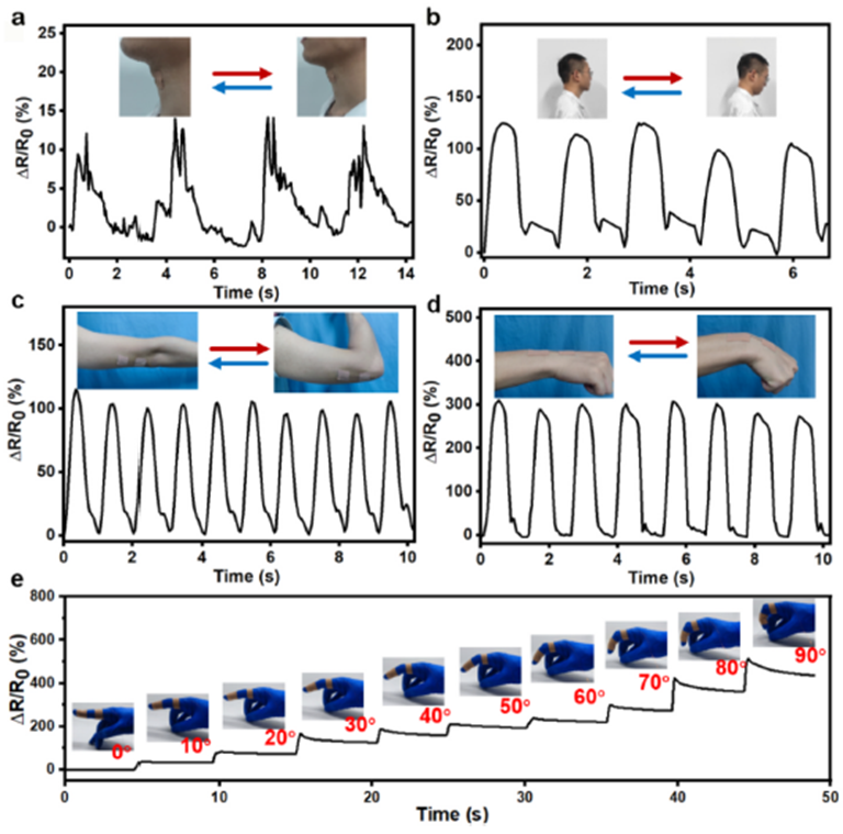 6 CBs/TPU纤维监测人体运动的电阻响应曲线。(a)监测吞咽行为。(b)监测点头时颈部肌肉运动。(c)监测肘部弯曲运动时肌肉收缩和松弛。(d)监测腕关节运动。(e)监测手指从0到大90°不同角度弯曲运动。