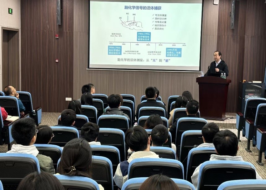 毛兰群教授围绕“解读大脑的分子语言”这一关键科学问题,从脑化学层面阐明化学信号如何转导为电信号,并详细介绍大脑信号的捕获、传递与调控机制。毛教授通过实现选择性活体电催化的构象研究,系统介绍碳基电催化、酶基电催化和脑信号传感等现代技术方法。此外,毛教授还重点讨论了脑分析化学中的“信号除杂”问题,提出石墨炔因其结构与性能的高度可调性,可能成为未来研究的新方向,开启大脑研究的新机遇。