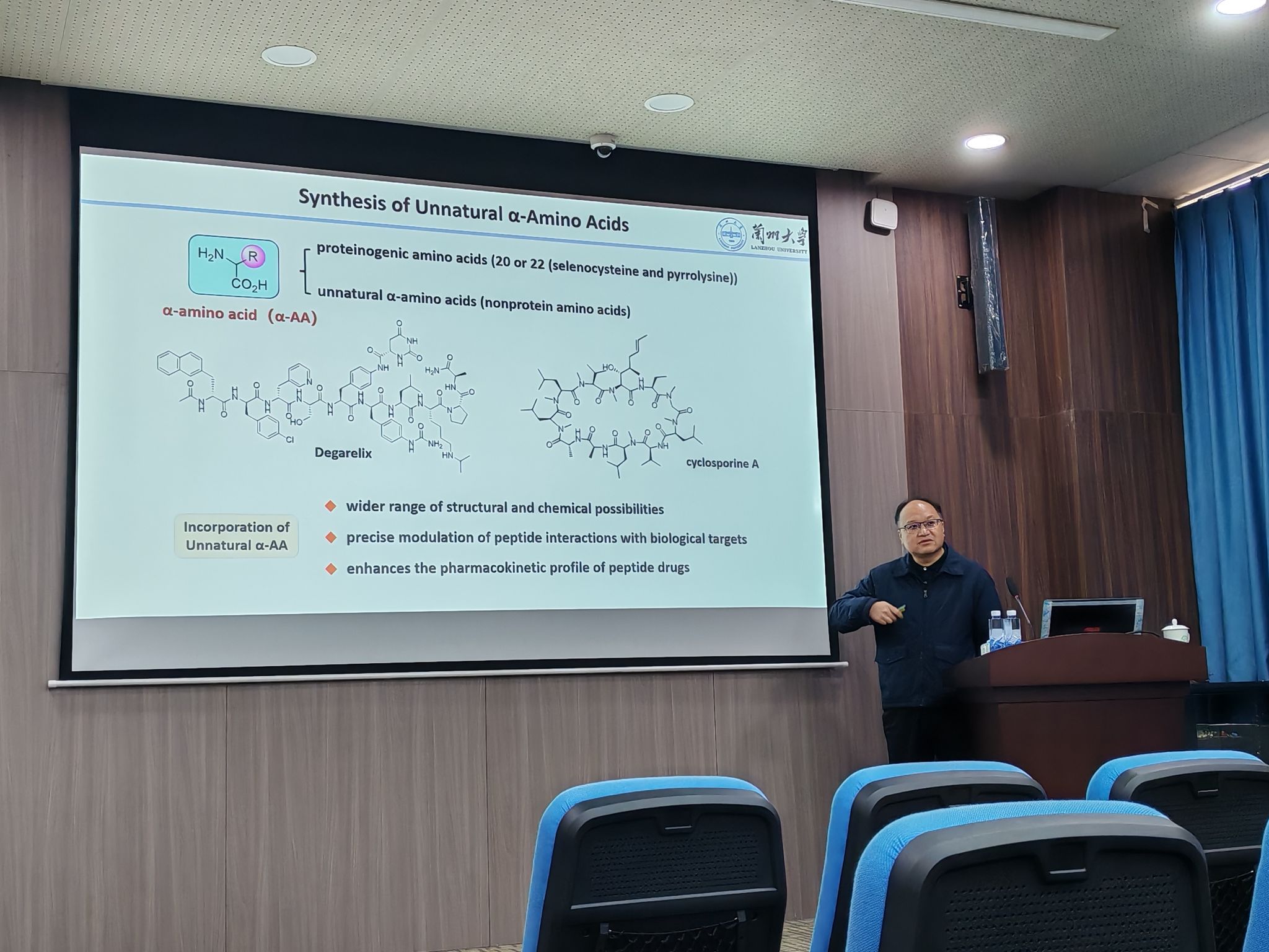2024年12月17日上午,兰州大学许兆青教授应澳门六合彩开奖网 邀请,于工业中心C座103报告厅开展以“可见光驱动非蛋白源氨基酸合成及多肽修饰”为题的“创源”大讲堂研究生学术报告。此次报告由王勇副院长主持,彭羽教授、刘祥伟副教授、郑剑峰副教授、肖检博士以及众多澳门六合彩开奖网 研究生参加了此次学术交流活动。