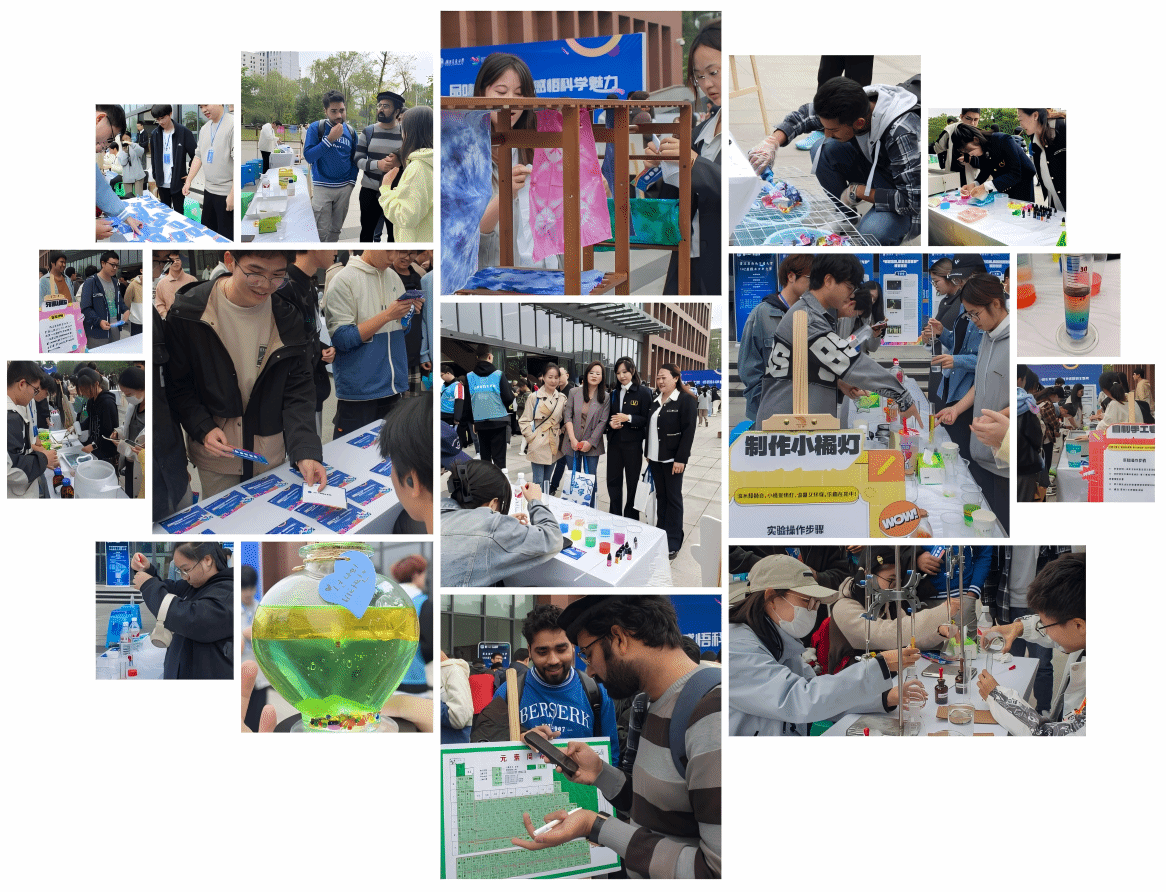 化学文化节活动现场开幕式结束后,西南交通大学第一届化学文化节文化盛典正式启动,现场共设有“化成天下 学以聚之”化学科学家精神展览、“流光化影,我身边的化学”摄影作品展览、趣味化学实验体验和化学知识竞答四大展区,向全校师生普及化学知识、展现化学之美、宣传化学文化,让越来越多的老师和同学认识化学、爱上化学。