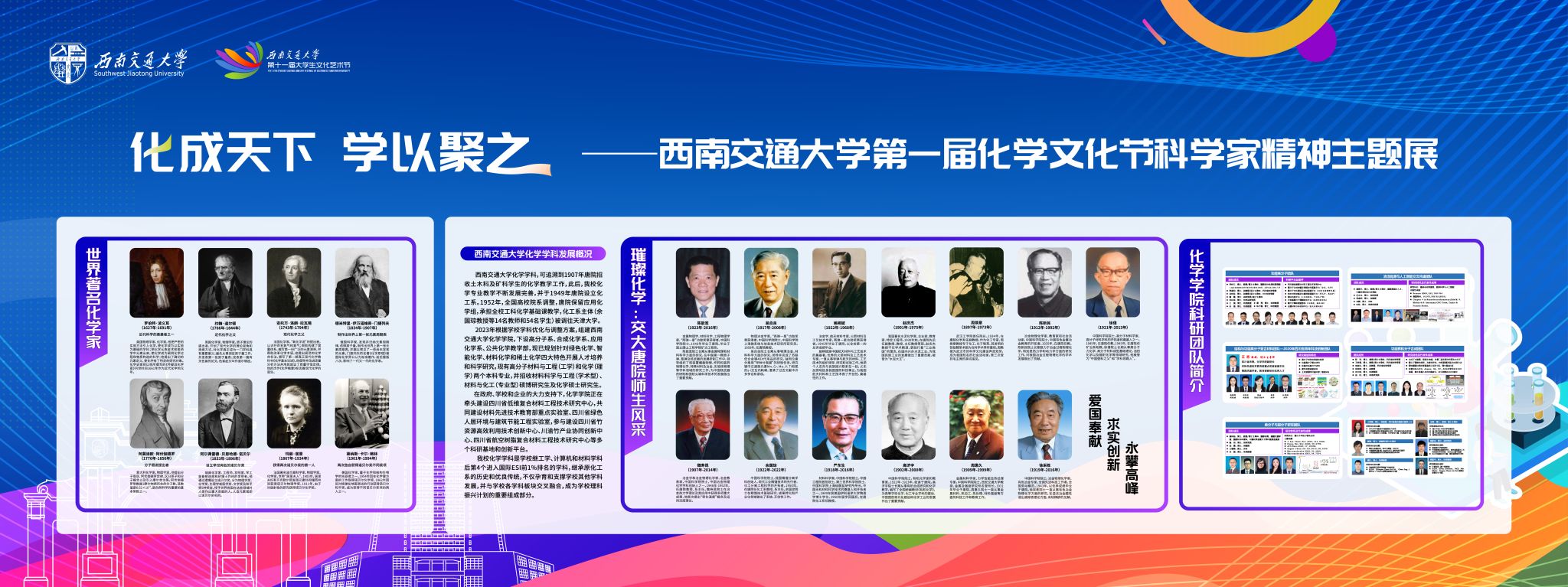 ,但回溯历史,我校化学学科的建设发展可追溯到1907年唐院化学教学工作。一直以来,交大化学人始终坚持爱国奉献、求实创新、永攀高峰的精神文化,勇担报国使命,为强国建设、民族复兴贡献着化学力量!