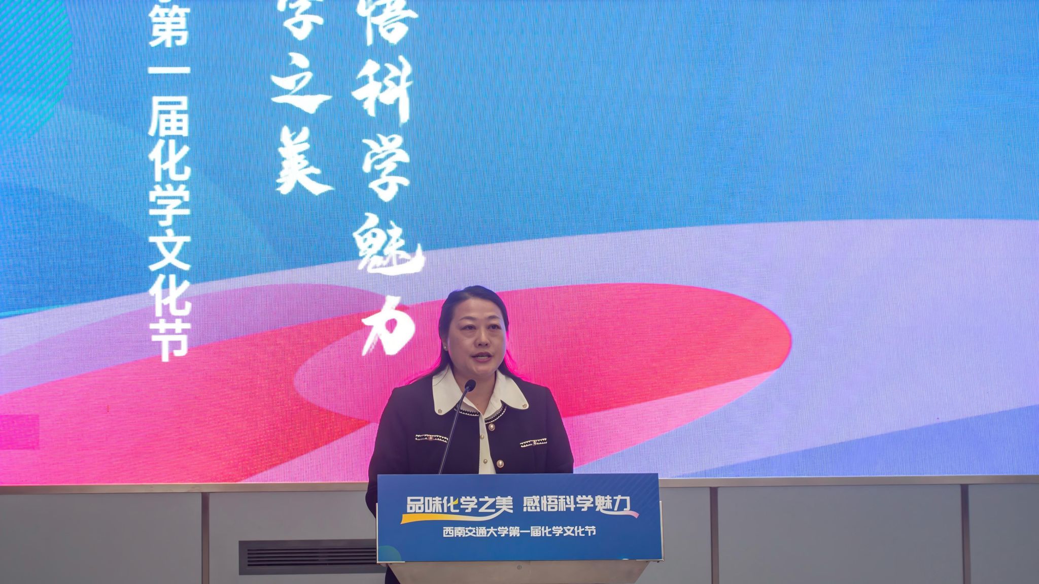 张春燕副书记为开幕式致辞。她指出,化学作为一门中心科学,不仅是自然界奥秘的探索者,更是现代科技发展的基石,还蕴含着无尽的美学价值。一直以来,交大化学始终以实干奋进之姿,在化学领域的前沿探索、人才培养、科技成果转化等方面稳步前进,为以“交大方案”破题“因地制宜发展新质生产力”积极贡献了化学力量!而化学文化节则承载着“让交大学子感悟化学之美,追求科学真理”的希冀。张书记祝愿广大师生能在本届化学文化节中有所收获,用心去感受、用智慧去探索化学的魅力与挑战。