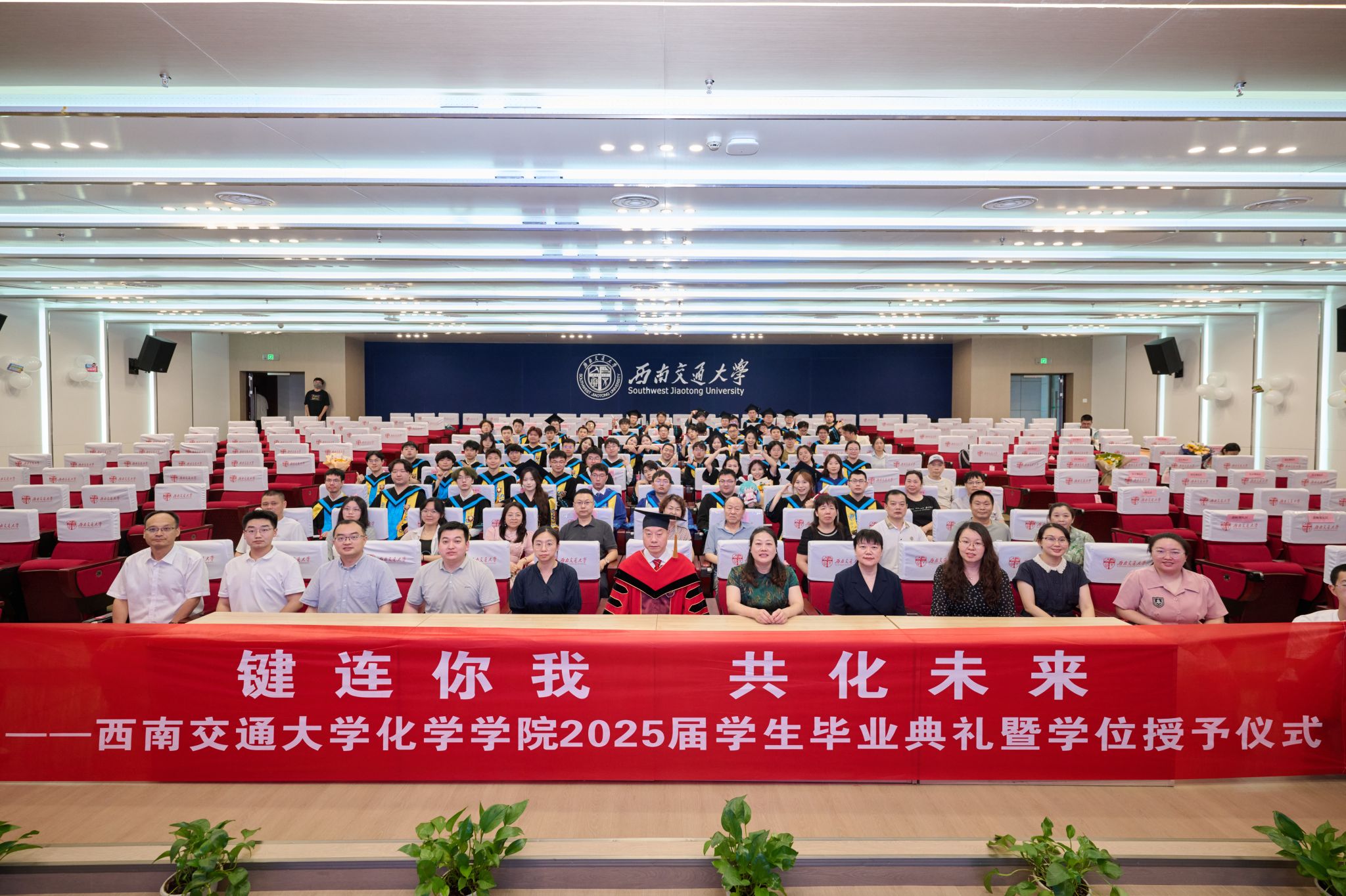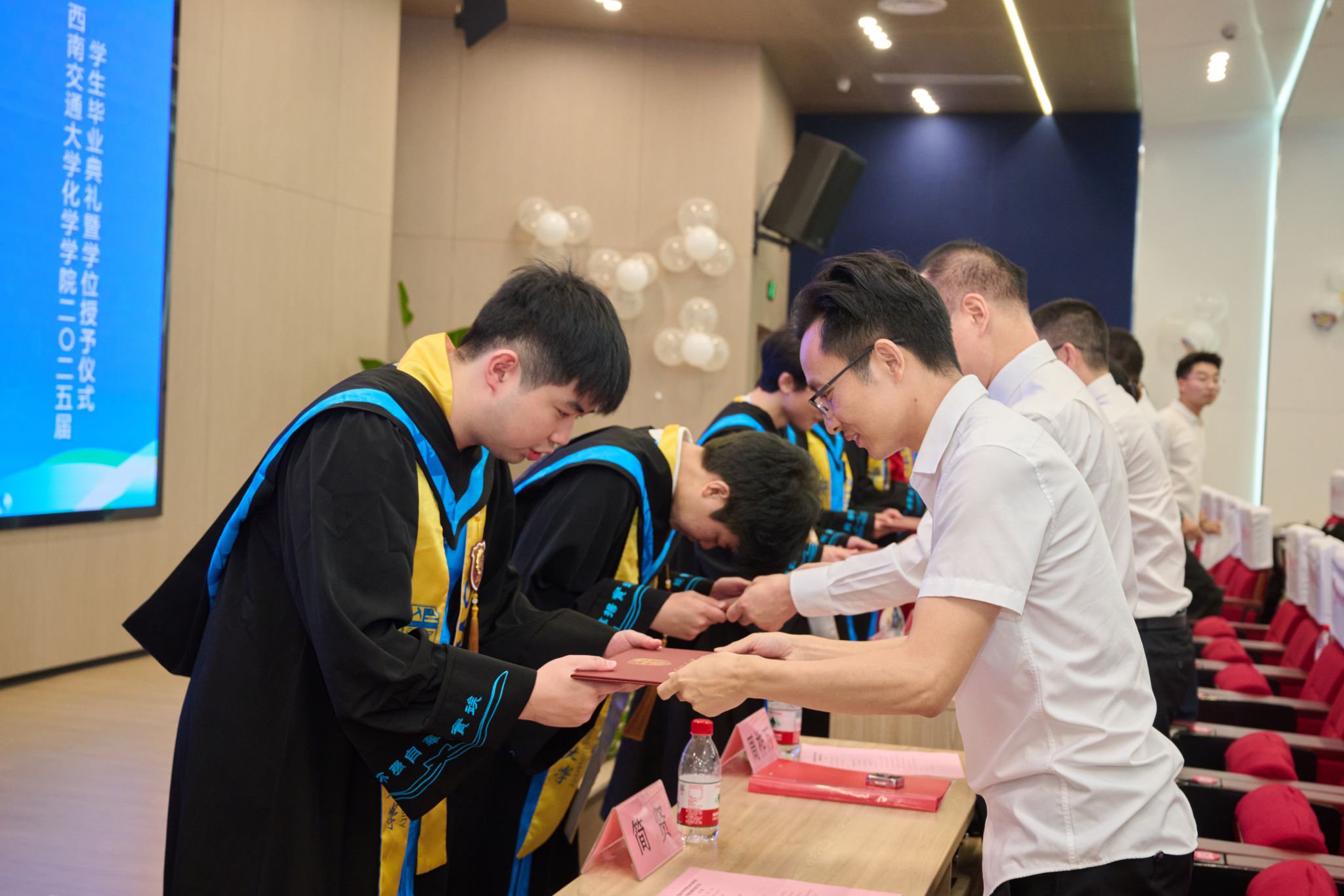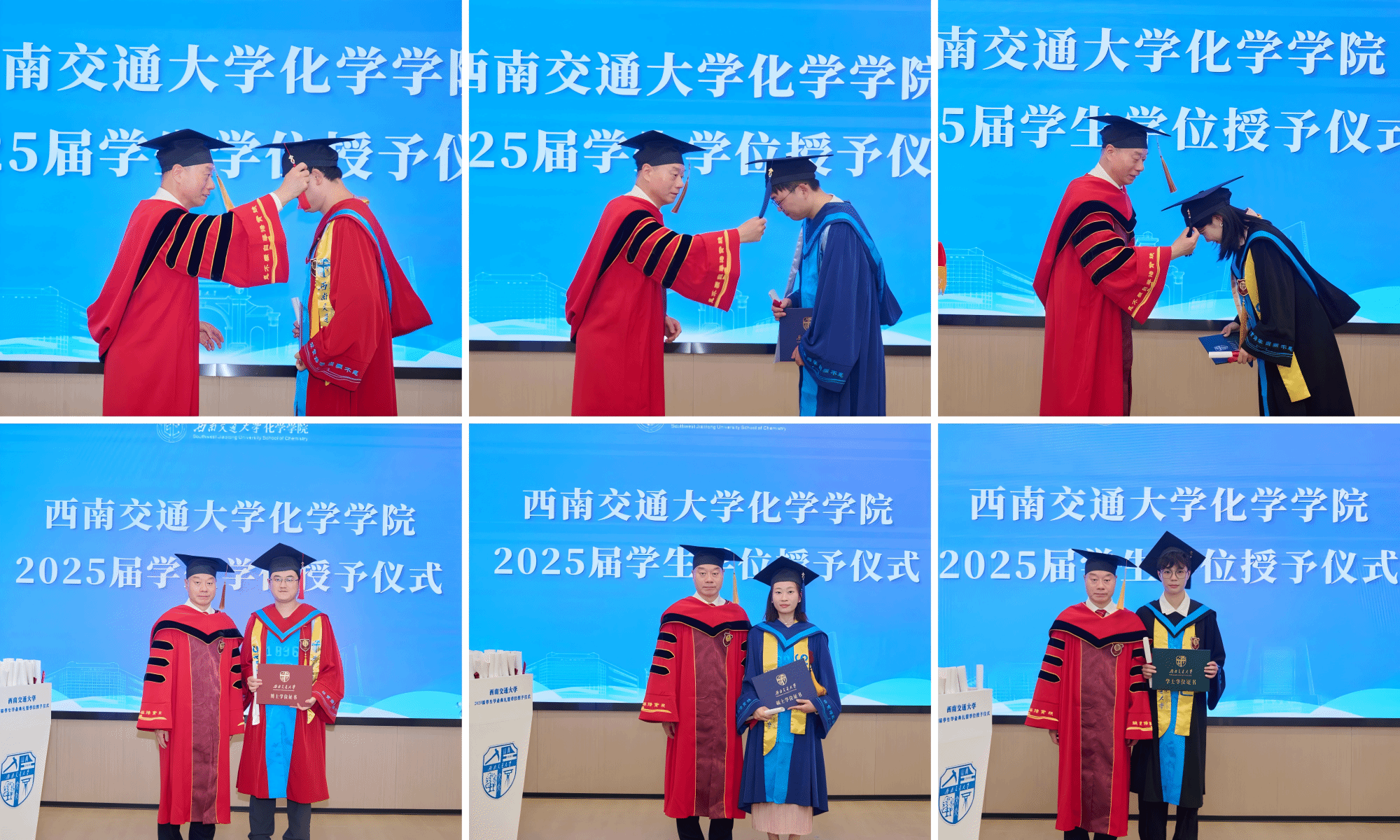 举行了2025届学生学位授予仪式。周祚万院长逐一为2025届博士毕业生、硕士毕业生、本科毕业生授位。毕业生们依次上台接受院长拨穗授礼,并合影留念。