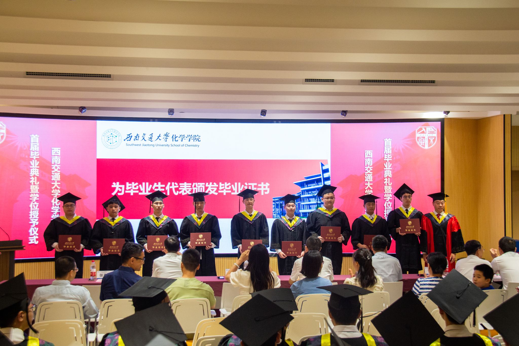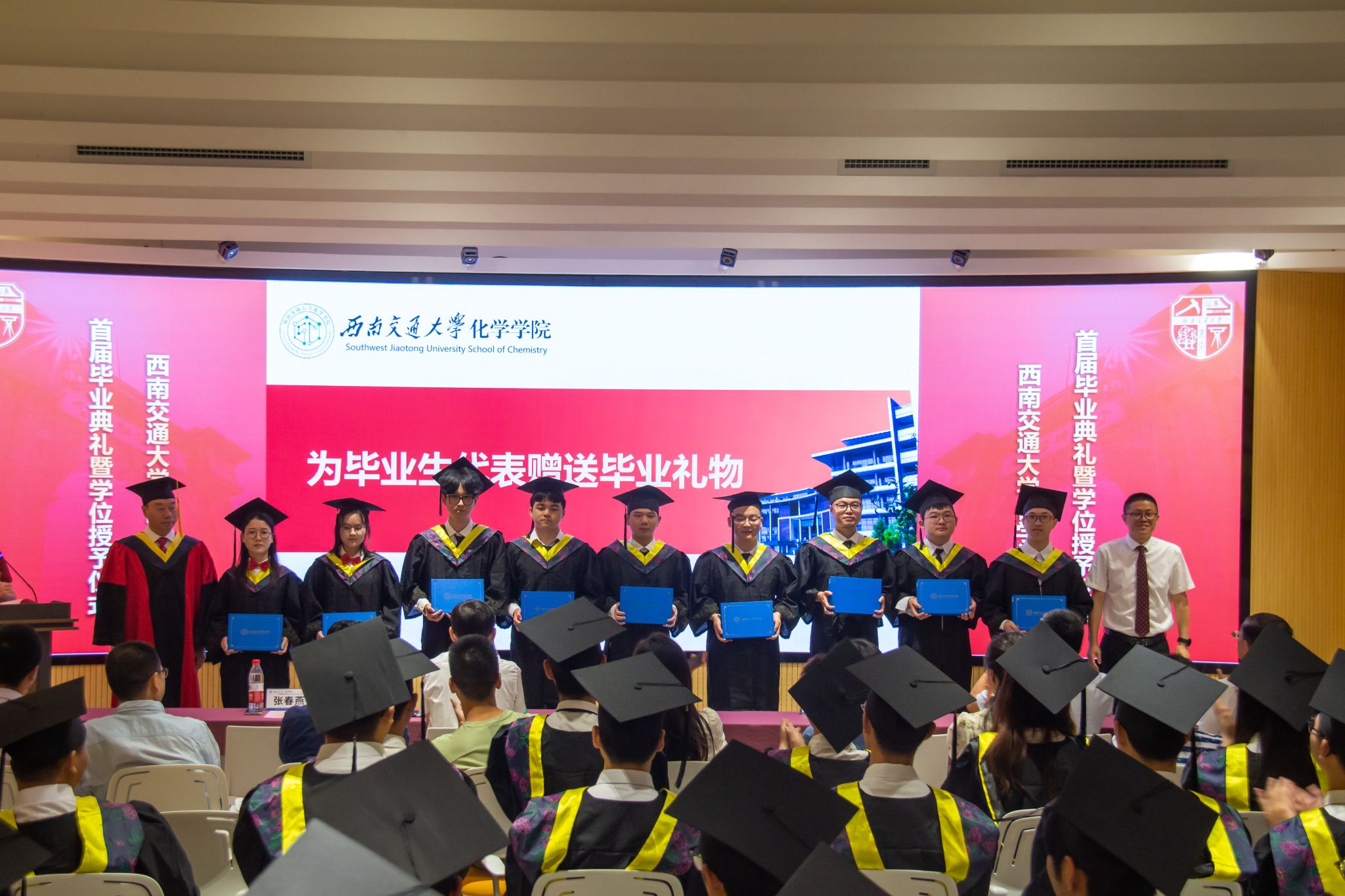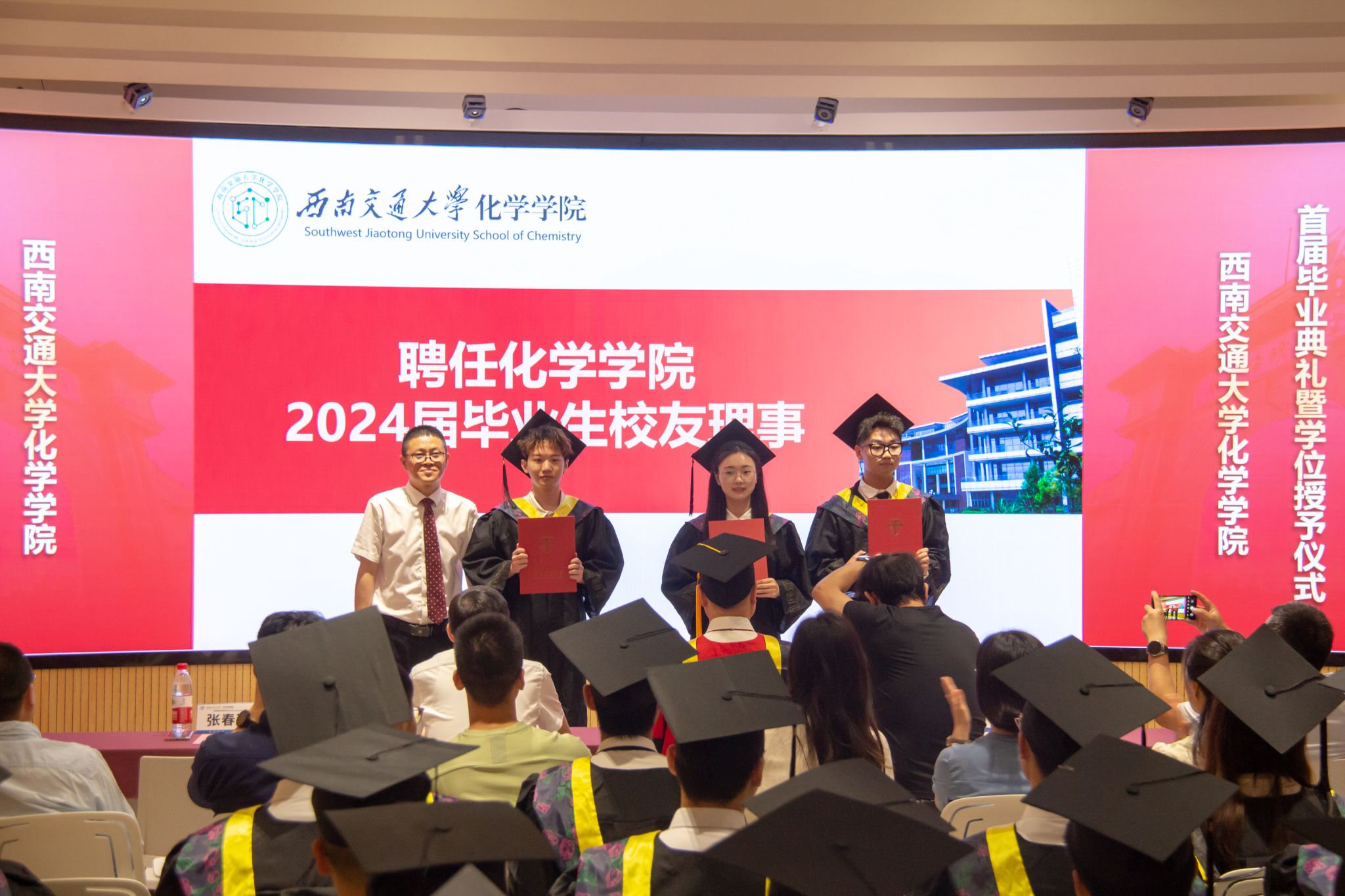 举行了2024届学生学位授予仪式。周祚万院长逐一为2024届博士毕业生、硕士毕业生、本科毕业生授位。毕业生们依次上台接受院长拨穗授礼,并合影留念。