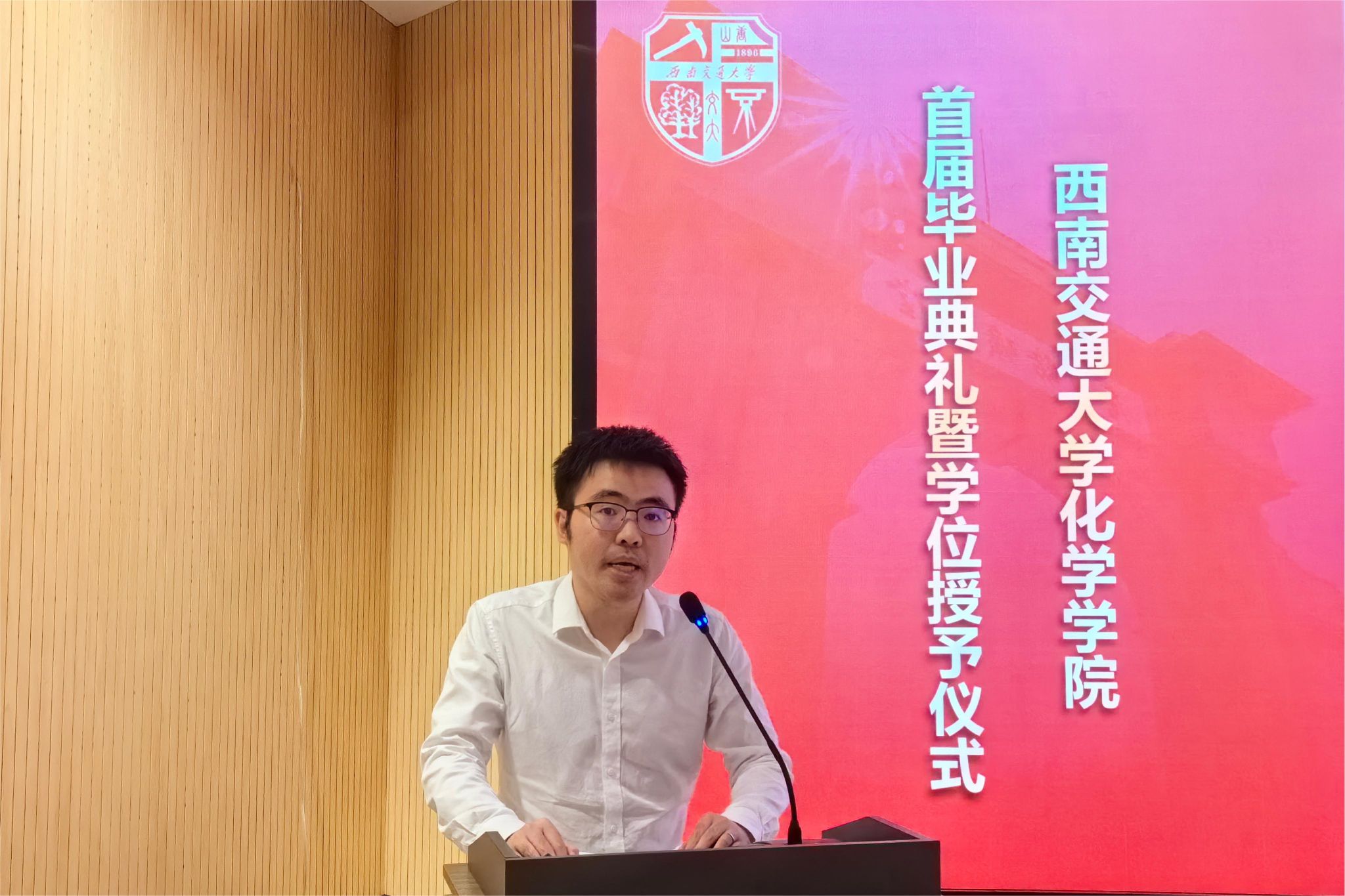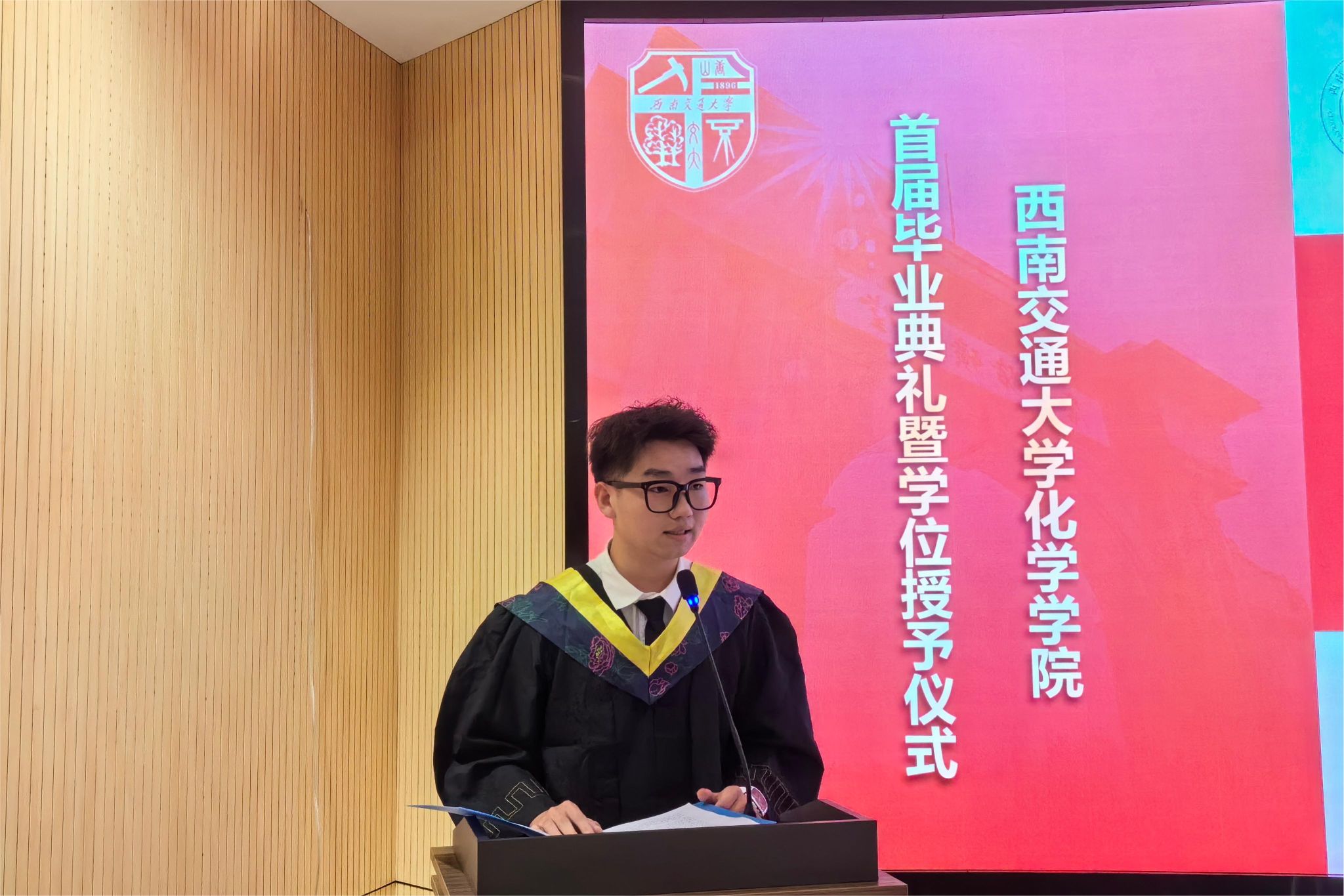 本科毕业生魏浩同学发言,他代表同学们对母校、母院的辛勤培育表示崇高的敬意和衷心的感谢。他表示,化院毕业生们一定会传承“竢实扬华 自强不息”的交大精神,在祖国各地继续书写与犀安路999号的奋斗故事。