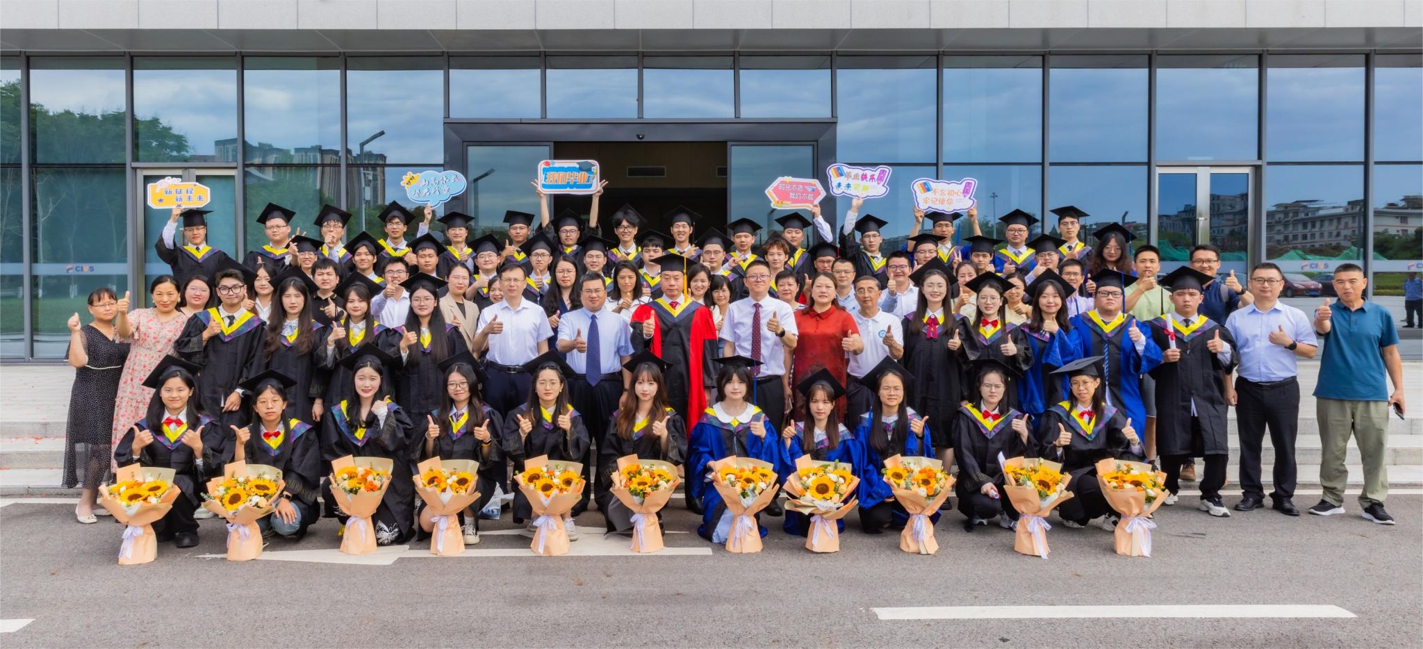 领导老师、家长代表合影留念,全体毕业生用“化样年华 求实创新”的响亮口号,表达了对母院的深深眷恋和美好祝愿。