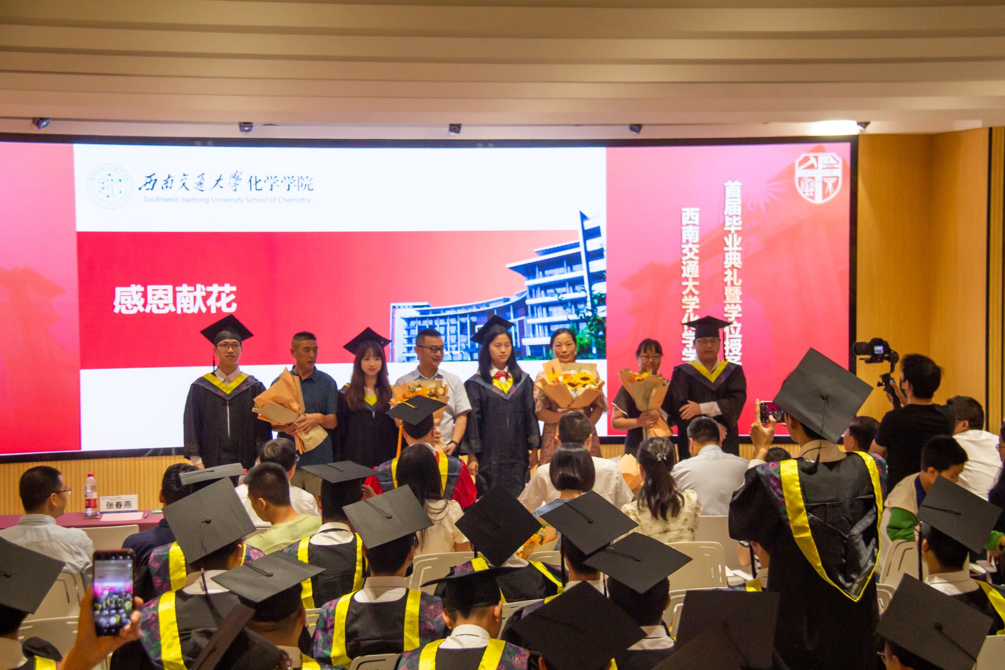 党委书记向仲敏,院长周祚万,党委副书记张春燕,副院长王勇、崔树勋,院长助理郑剑峰,离退党支部书记管棣,高分子系主任杨静晖、副主任高霞,化学专业负责人王雅雯,合成化学系主任彭羽,应用化学系主任王萃娟,公共化学教学部主任刘睿颖,原本科2020级学生辅导员郑纪伟,本科2020级学生班导师,专业课教师,学生工作组全体辅导员,全体本科毕业生、研究生毕业生代表及学生家长出席典礼。典礼由张春燕副书记主持。