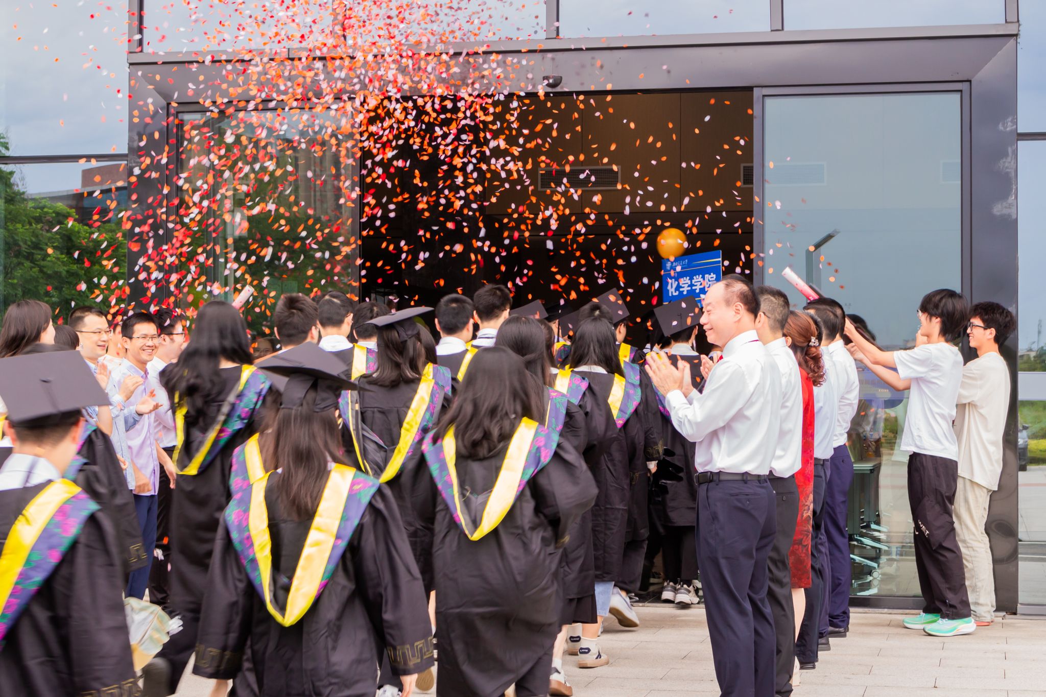 全体党政领导、教师、家长以及学弟学妹们在入口处欢迎毕业生们入场。